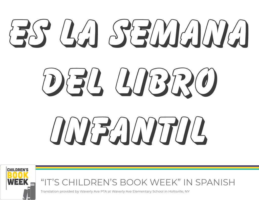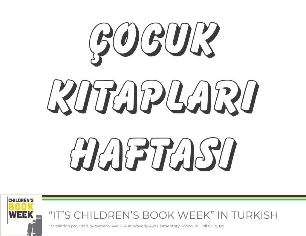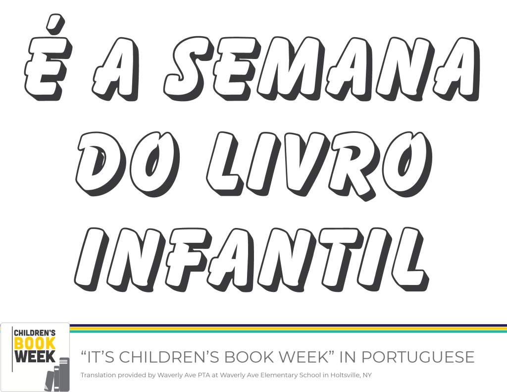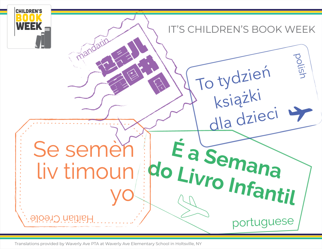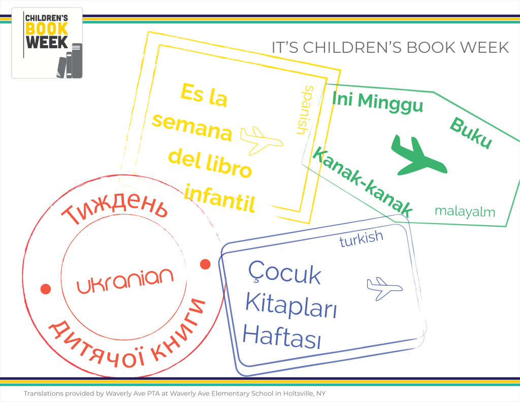 Waverly Ave PTA at Waverly Ave Elementary School in Holtsville, NY compiled the phrase “It’s Children’s Book Week” in several languages. Display traveling stamps or enjoy coloring bubble letters of the different languages or create your own in your own language!