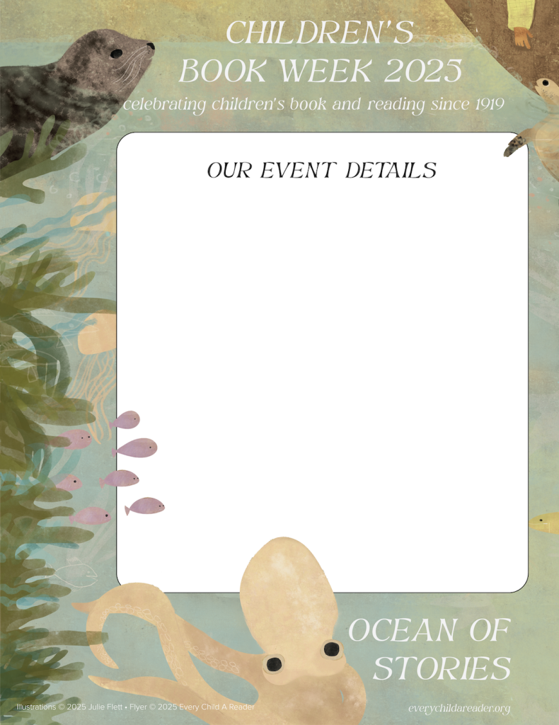 Children’s Book Week is a national week-long event that celebrates books for young readers. 2025 is the 106th anniversary of this beloved program, and this year’s event slogan is An Ocean of Stories. This slogan celebrates the vast, collective ocean populated by the stories we read, share, and tell. Come into the [store/library] any time during the week and celebrate with us by ______________________. You can also celebrate using all the amazing free resources at EveryChildaReader.net. Follow #StoryOcean online for more.